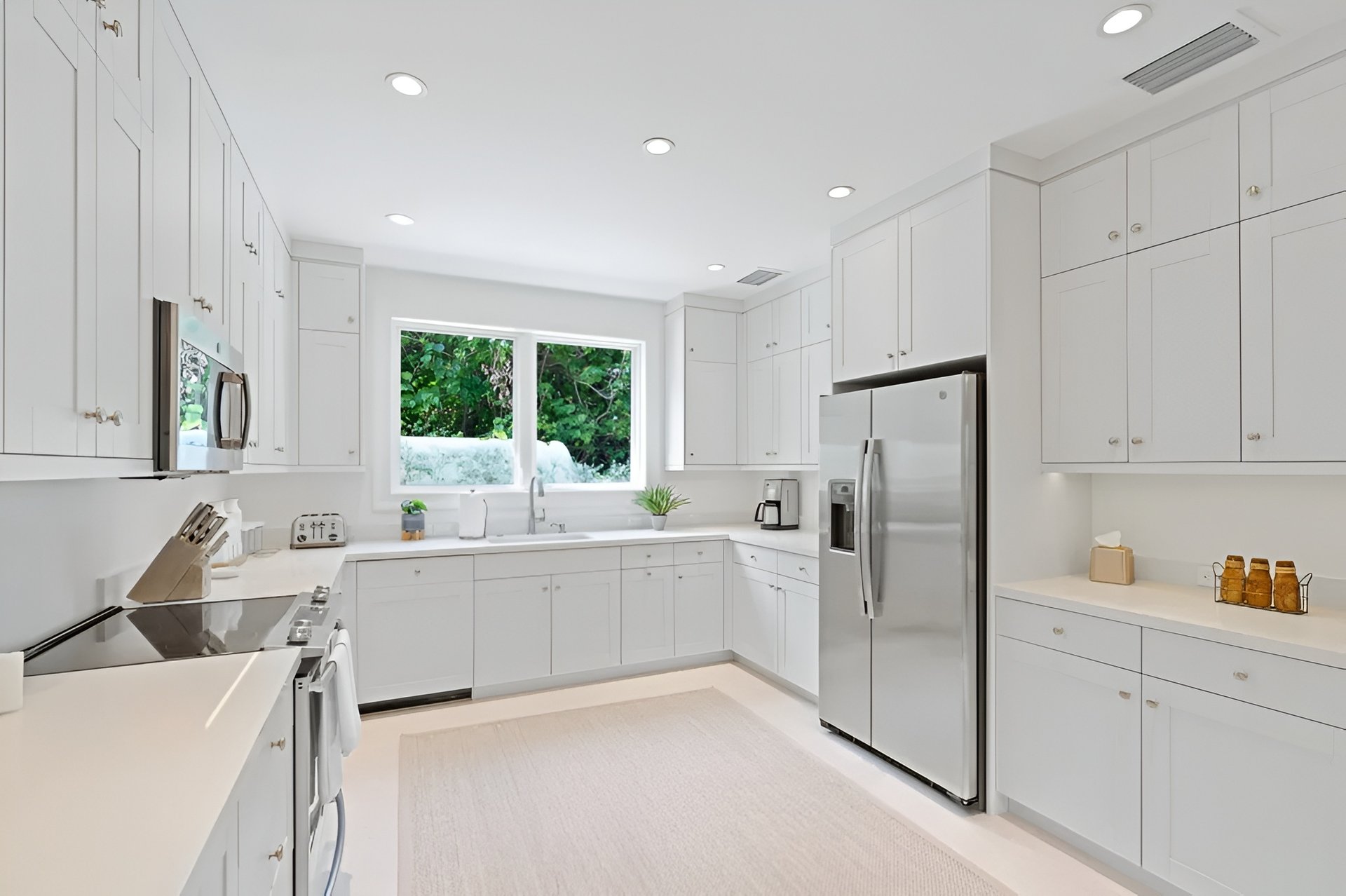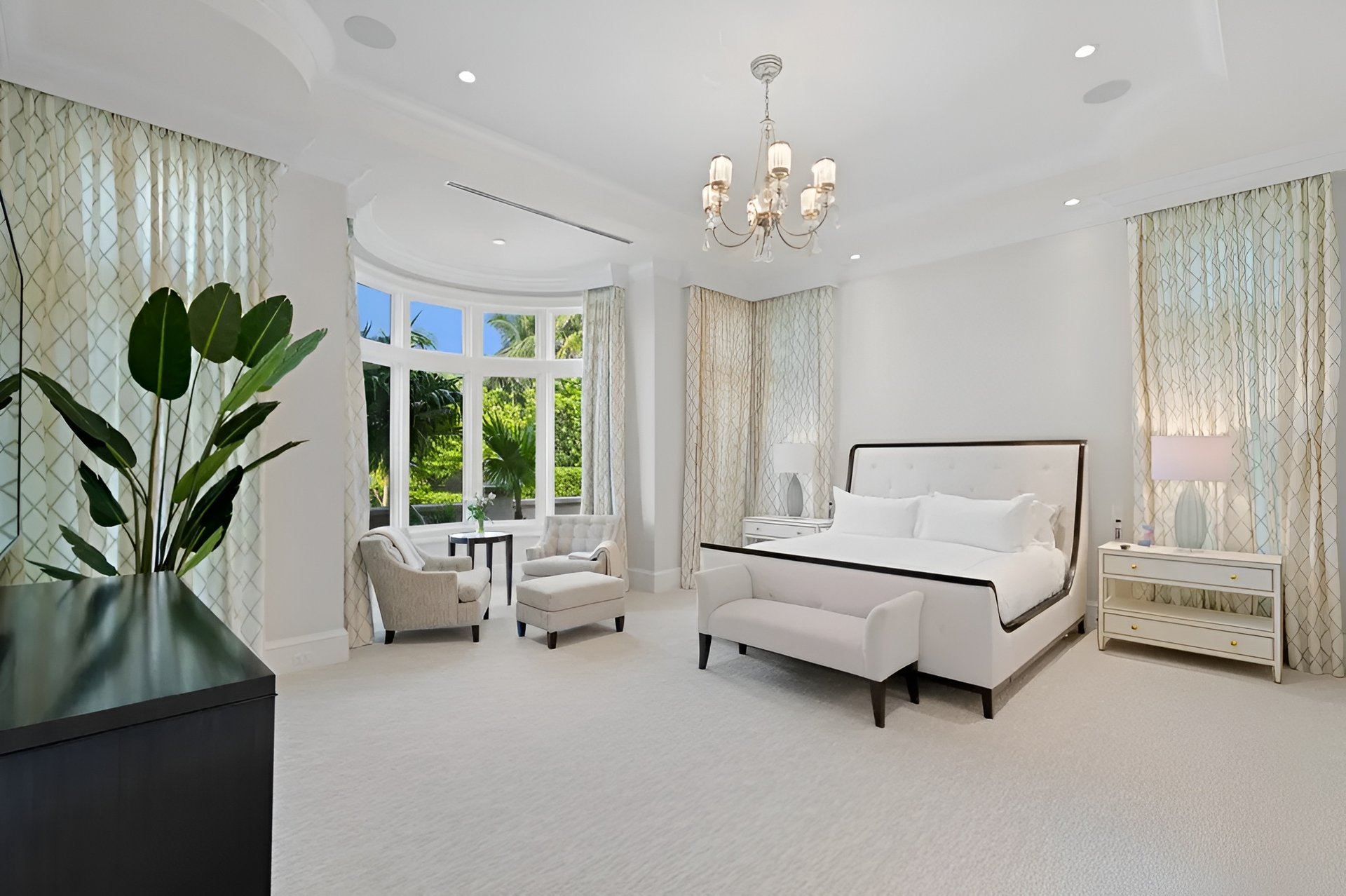 Design details include a large great room in the main house, along with a chef’s kitchen and a private primary bedroom wing. The manicured, lighted grounds — by landscape architects at Lang Design Grou— include 200 feet on the ocean and 200 feet on the Intracoastal.