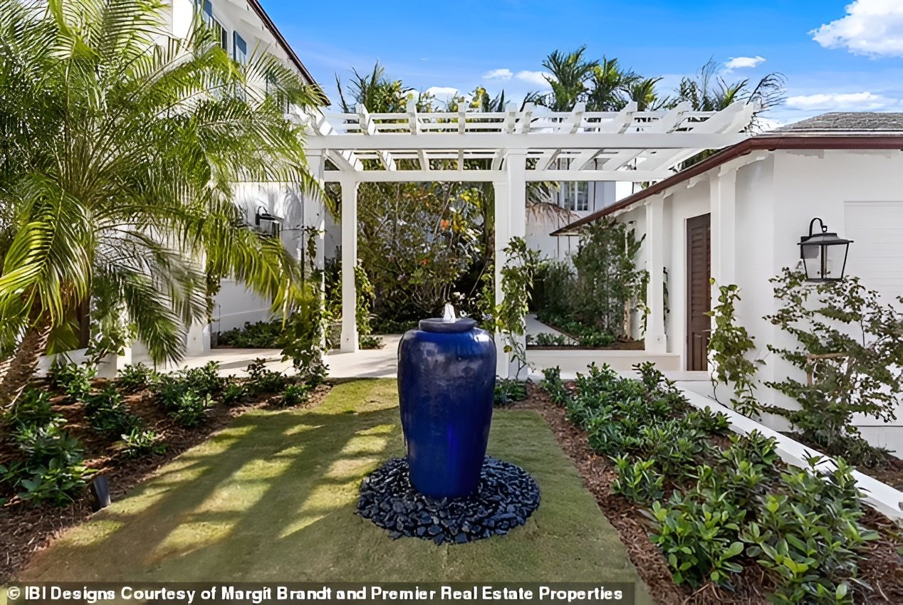 The property has a grass courtyard, in the center of which stands a small fountain that burbles quietly. Behind it, a Mediterranean-style pergola provides some shade and throws a checkered shadow across the grass