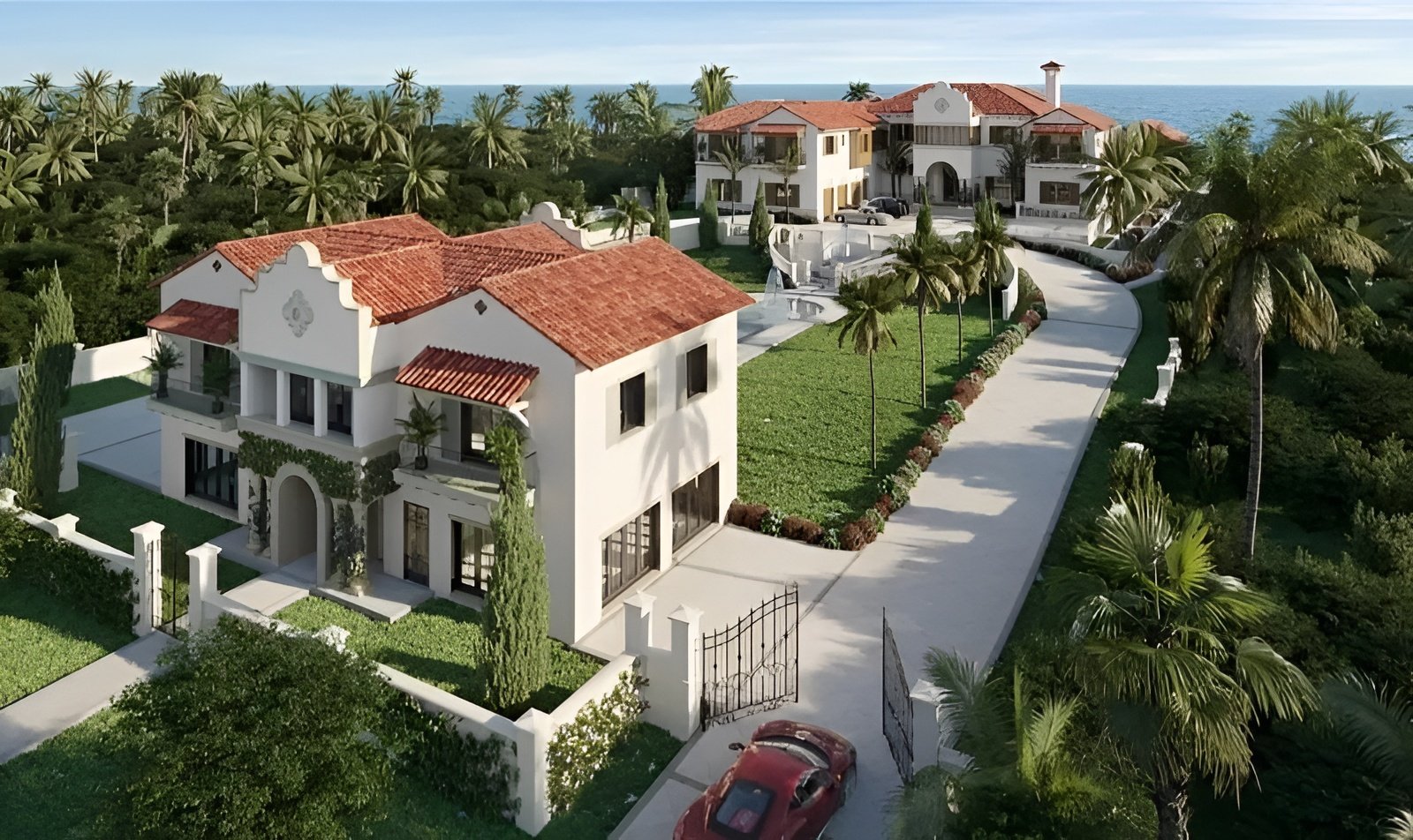 Before Developer Farrell Cos. Bought the Ocean-To-Lake Estate at 1140 S. Ocean Blvd. in Manalapan in January 2024, a Renovation-And-Addition Project Was Already Underway on The Property. That project, seen in This Rendering, included a Guesthouse, Foreground, and The Oceanfront Mansion in The Rear. Provided by Douglas Elliman Real Estate